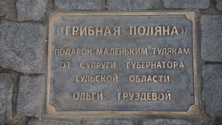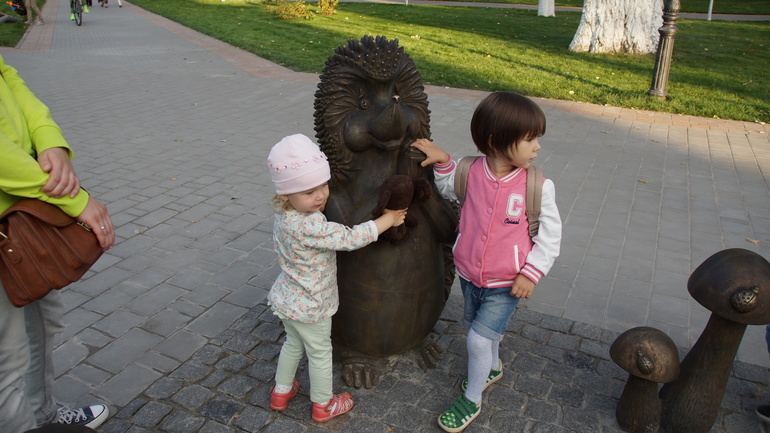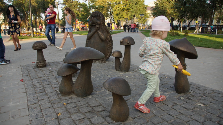 Вот такая грибная композиция появилась в Кремлевском сквере. Ёжику дети уже натерли нос до блеска.