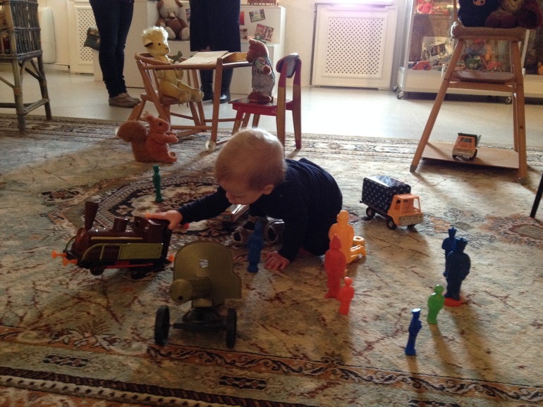 Тут вообще хорошие музеи - небольшие, со вкусом оформленные, не оставляющие после себя ощущения провинциальной тоски. В одном из них - музейно-выставочном комплексе на Загорской, есть настоящая избушка, а на втором этаже - чудесный отдел советского быта, где помимо всего прочего представлено множество игрушек, в которые играли ровесники наших бабушек. Кое-что из экспонатов можно потрогать, а в "детской" и вовсе поползать по полу со старинным паровозиком. Что Даня с удовольствием и сделал.