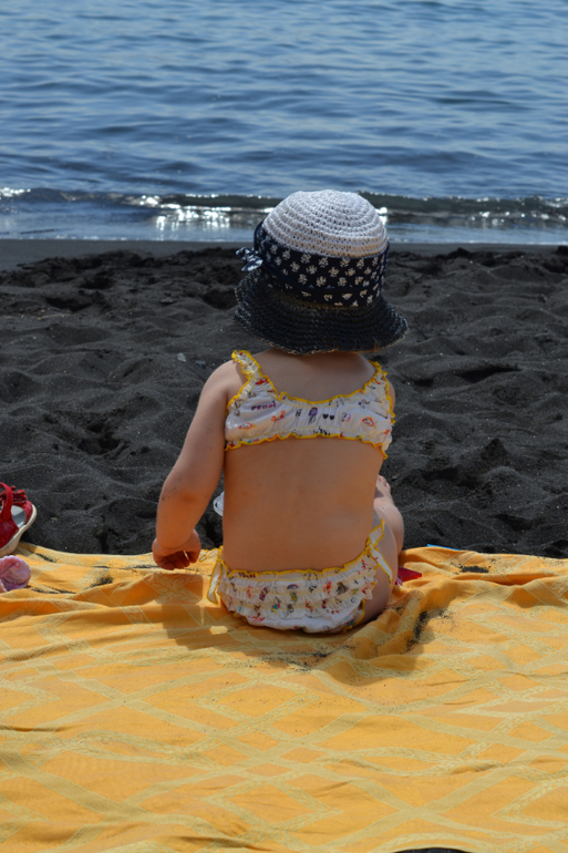 Черный песок, синяя вода, желтое покрывало и купальник в тон)))