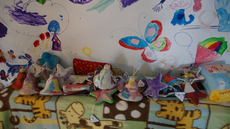 Мы успели порисовать шар-папье. Это тульское изобретение - игрушки из толстого картона. Придумал такую творческую развлекалочку несколько лет назад хозяин местной типографии "Золотой шар". Вот сколько шар-папье разрисовали дети за один день. Наша звездочка желтая с фиолетовым самая крайняя с правой стороны.