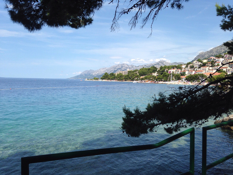 Море потрясающей красоты, но холодное. Для меня. Для детей и мужа вода комфортная, они бы не вылезали. Я в море захожу минут 15, а Софи тут же плюхалась и вытащить из воды ее было крайне сложно. Вода наичистейшая и на приличной глубине я видела свои ноги, и рыб, и дно! Чаще всего мы ходили на пляж, который располагался непосредственно под нашим апартаментом, но путь к нему был сложен. Мы жили на 3 этаже, далее один этаж вниз по ступенькам до след улицы, далее еще одна крутая лестница уже к морю. Младший в рюкзаке, старшая слава Богу пешком, у мужа коляска, рюкзак и матрасики. Фитнес еще тот! Но нас это не расстраивало. Вот как ни странно ни на секунду не расстраивало и даже не знаю почему, хотя были нагружены как ослы, а ведь накупавшись и назагоравшись еще и обратно возвращаться. Можно было бы и обойти по дороге, но это занимало бы немало времени. Ведь мы бы приходили в центр и потом по пляжу нужно было бы возвращаться обратно. Береговая линия узкая и людей очень много. место, конечно, находили всегда, но порой такое обилие людей напрягало. Мы с мужем уже бывали в Хорватии, тогда еще бездетные. так вот от людей мы уходили на скалистый берег и красота. Так вот на правой части, рядом с нашим домом пляж мелкогалечный, золотистого цвета, порой настолько мелкий, что можно и куличики делать и замки строить. В левой стороне, там, где пляж пунта Рата камни белые и покрупнее. Мы находили километры. И по пляжу и по самой Бреле.