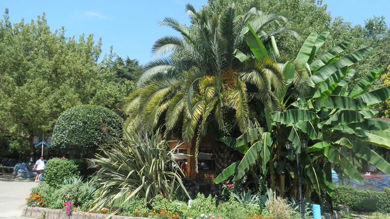 Приморский парк. В жару находится на море не реально. Даже просто в домике приходится выживать, обливаясь потом. Тут как раз кстати приморские парки - в Пицунде множество сосен, в Гагре парк с невероятным разнообразием реликтовый и экзотических растений. Даже Воронцовский парк отдыхает. Тут аурукалия в прямом доступе и большом количестве, а не за заборчиком как в Алупке. Финиковые и сабельные пальмы, магнолии, лимоны, эвкалипты, бананы, мандарины, бамбук, лавровишня, хурма и множество реклитовых деревьев со сложнейшими названиями.