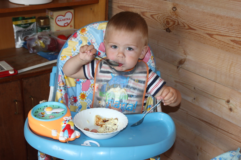 Темочка в доме маленький хозяин.... Кушает усердно сам, да еще и двумя ложками...