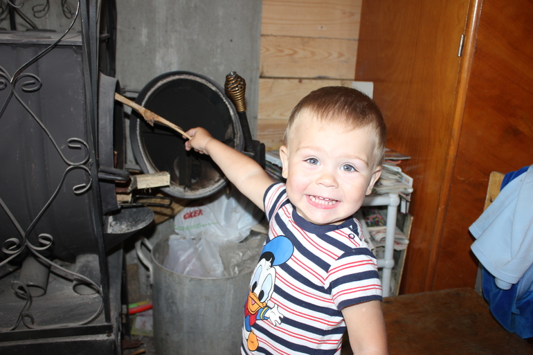 Обожает накладывать дрова в печку... Теперь только и следить, чтобы угольков там не было.... А то ведь и разгореться может. Когда печка топится, боится подходить.... Но тяжело.. нужно все время быть начеку...