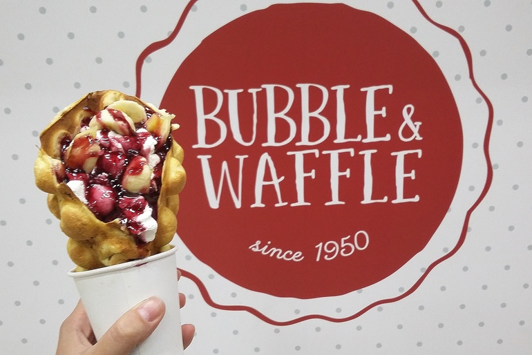После того как накупались поехали за вкусняшками. Напротив нашего отеля было кафе Bubble & Waffle, где готовят очень вкусные вафли. В шарики вафель на выбор добавляют всякие разности - у Миры был m&m, а у меня кусочки kit kat, внутри взбитые сливки, фрукты и сироп.