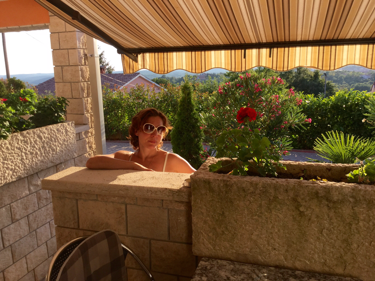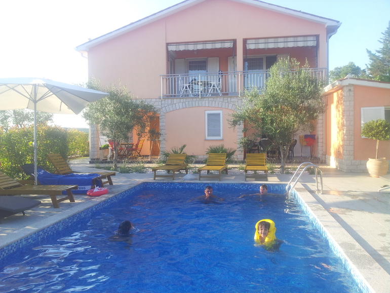 Уставшие и толком не освежившиеся, поехали искать свои апартаменты. Это апартаменты Bellistra на окраине Лабина. Вилла на 5 номеров. Муж с детьми сразу занырнули в бассейн, пока я разбирала вещи.