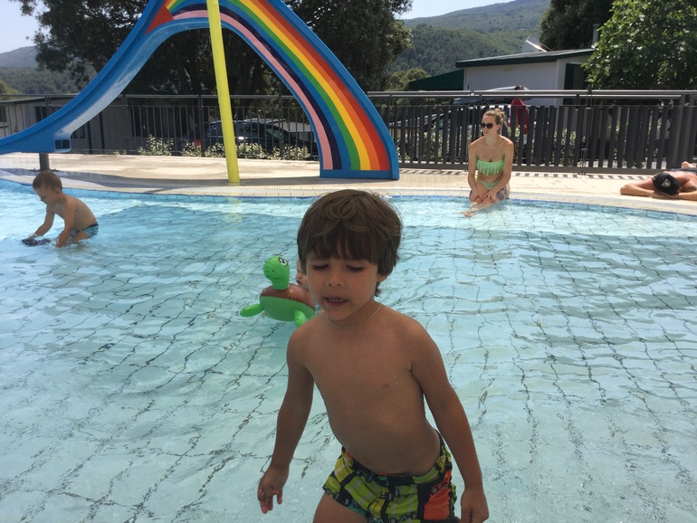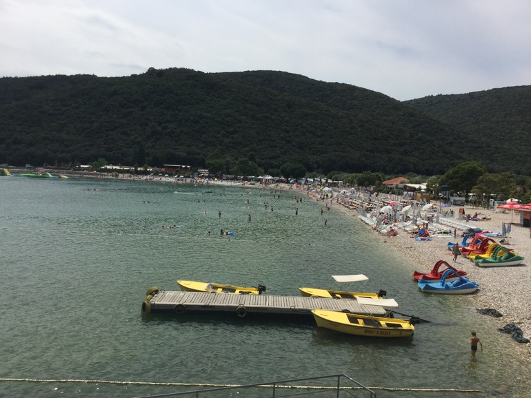 Пляж не понравился. Открытое место и довольно острые камни. Рядом пара отелей и кемпинг Олива. Здесь хотела взять мобильный домик по спецпредложению Букинга, но не успела. Кемпинг мне не понравился. Как-то пыльно и жарко. Бассейн переполненный. Хорошо, что не удалось забронировать здесь домик.