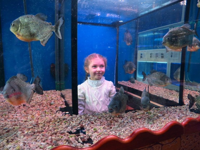аквариум небольшой, небогатый, из интригующего - только круговой аквариум с маленькими акулами и скаты под прозрачным полом.
