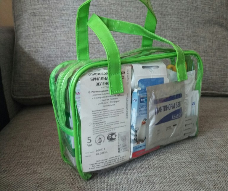 Аптечка в дорогуАптечка это самый важно что я тщательно и заранее собираю в поездку. Даже красивую косметичку приспособила, она прозрачная, все видно, можно составить список, что от чего, и по сколько давать, т к я беру лекарства без упаковок и инструкций.
