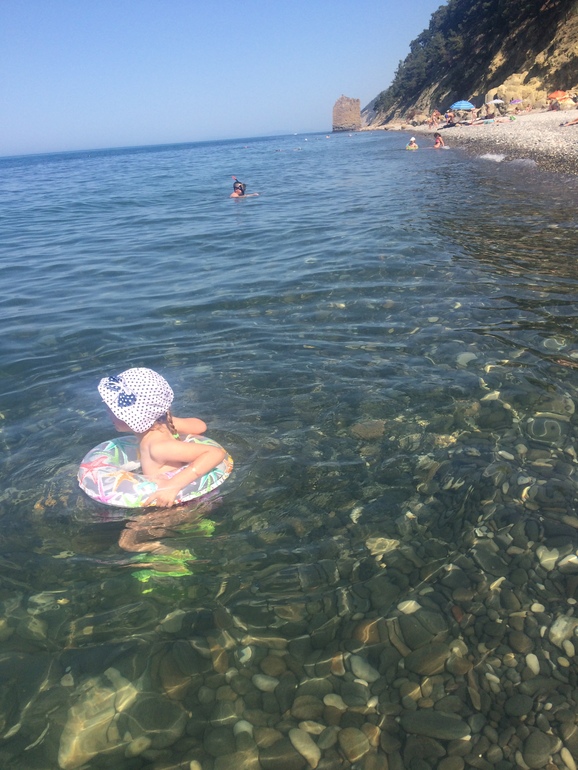 Кстати по поводу моря расскажу один случай. Мы первый раз приехали на пляж, рядом с морем протекает горная речка. Стоим мы полотенца раскладываем, а дочка говорит: А там змея...мы ей: да какая змея, Ариша, это палка. А ребенок упорно: там змея. дед пошел смотреть. Приходит и говорит: там точно змея, живая. женщины, которые лежали недалеко, подтвердили, что предупреждали о том, что могут быть змеи. Мы очканули конечно, первым порывом было уехать нафиг отсюда, но потом смотрим, народ загорает, плавает. Мы отошли подальше от этой речки и загорали там. Потом уже конечно забылось и никаких змей не видели. Но факт-ребенок 4 лет, который видел змей только на картинке, да еще с такого расстояния разглядел ее...