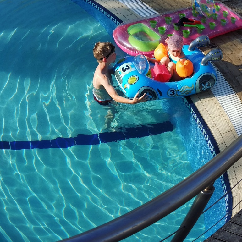 Для детей в отеле много всего предусмотрено, детская площадка с горкой, детский бассейн 50см, много надувного, игрушки (ведерки, формочки, савки, сито). Старшая нашла себе по интересу. Для малыша: манеж-кроватка, стульчик для кормления в ресторане. А в номере у нас был мобильный стульчик.
