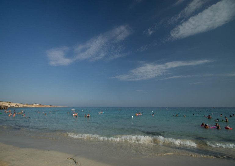 Очень красивая вода, шикарный песок. Такой же прекрасный пляж в Вароше, на северном кипре. И даже вода там покрасочнее, но турки не дружат с головой и адски загадили весь песок. Там уже не песок, а смесь песка, окурков и шелухи от орехов... на фиг три практически идеально чисто и практически так же красиво.