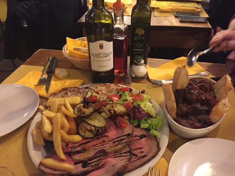 Не стали заморачиваться с выбором, и отвели мама в понравившуюся нам таверну La Fettunta. В этот раз заказали снова сырно-мясное ассорти (1 порция), Гранд пьятта (большая тарелка), мясо с черным перцем (перец был горошком, мясо оч.вкусное и не оч.острое), и запеченные под сыром баклажаны. Естественно не доели))) За обед с вином и пивом на троих - 55 евро.