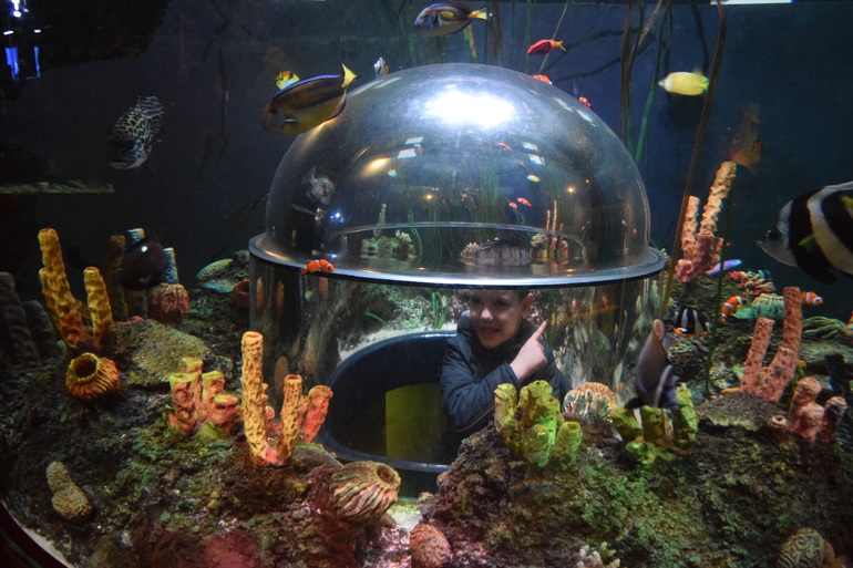 Все сделано для интереса детей - не просто аквариумы с рыбками и кораллами, а в каждый из них можно залезть "изнутри" и посмотреть как там все устроено))) Очень здорово!