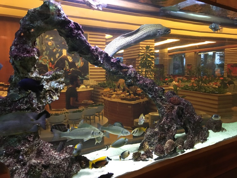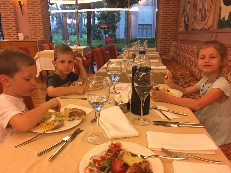 Вот что касается основного ресторана, то он немного не оправдал моих ожиданий. Выбор блюд невелик, мягко говоря (если сравнивать с другими турецкими пятерками), особенно это касается обеда. Ужин был хорош обычно.Но выгодное отличие в том, что всегда есть несколько видов мяса гриль, рыба гриль ( а также на пару или жареная). Несколько раз были креветки, в т.ч. королевские, мясо крабов, роллы и т.п. В остальном за 3 недели нам меню поднадоело. Тем не менее, всегда можно найти себе и детям что-то, хотя детского стола как такового нет - макароны, пюрешка, гречка и фрикадельки или отварное мясо, вот и всё. Супы были (обычно 1 там где паровое для детей и 2 в общей зоне), но зачастую это не те супы, что едят наши дети - то острые, то какие-то молочного цвета. Каш на завтрак было по две. Помню рисовую, гречку, манную и овсянку. Йогуртов/банок/творожков в ресторане Верде нет! Учитывайте. Но вы можете заказать, чтобы вам в номер в определенное время каждый день приносили детский йогурт (или молоко). Принесут. Вот с фруктами и сладостями там полный порядок. Всегда дыня, арбуз, клубника, яблоки, груши, виноград, персики, абрикосы, нектарины, ананас, несколько раз была черешня. Очередей за этим нет! Если что-то заканчивается, быстро пополняют. Вкусное мороженое. На обед ванильное и шоколадное, на ужин на раздаче в шариках накладывают разное. Теперь о грустном. По идее, столики обслуживаются официантами, которые приносят вам напитки (просят карту, если что). Но по факту, их не хватает и даже воду (!!!) приходится очень долго ждать. Нам обычно нужна была именно простая вода и официантов приходилось буквально вылавливать, пока дети ныли "хочу пить, дай воды". Под конец нашего пребывания просто брали с собой воду из номера. А так, если дождаться официанта, вам и фреши/соки и колу и кофе любой принесут, иногда, правда, к концу вашей трапезы)). Просто они реально замотанные и не успевают. Сладостей много. Но на обед мы потом ходили в Патиссерию за вкусняшками (вот там просто рай для сладкоежек) , благо, она рядом с рестораном находится, но работает с 10 до 18ч, по-моему.