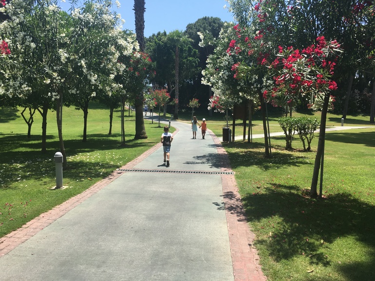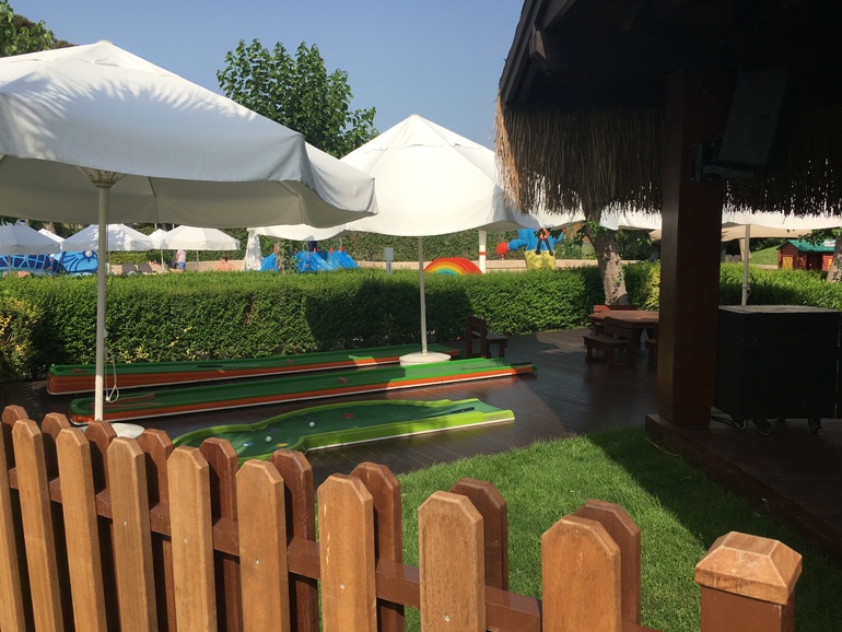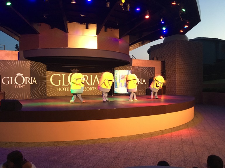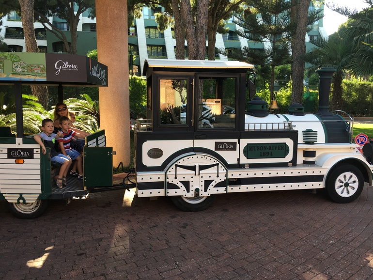Обязательно съездите в Глорию Гольф (там отличный аква-парк) и в Глорию Серенити (там прекрасный мини-клуб). Каждые пол-часа ходит автобус или паровозик. Ехать недолго - 7-10 минут. Сначала заезжают в Глорию Гольф Клаб (там гольфистов высаживают), далее мини-зоопарк, далее Серенити (можно прогуляться от зоопарка, это недалеко) и последний Глория Гольф ресорт. Во всех отелях вы можете пользоваться бесплатно услугами баров/ресторанов.В Глории Гольф нам предлагали услуги по обучению плаванию для детей (я так поняла, бесплатно), в Глории Верде я этого не встречала. И да, еще в Гольфе и Серенити отели и море разделяет речушка, там водятся огромные черепахи, уточки и много рыбок. Дети были в восторге!