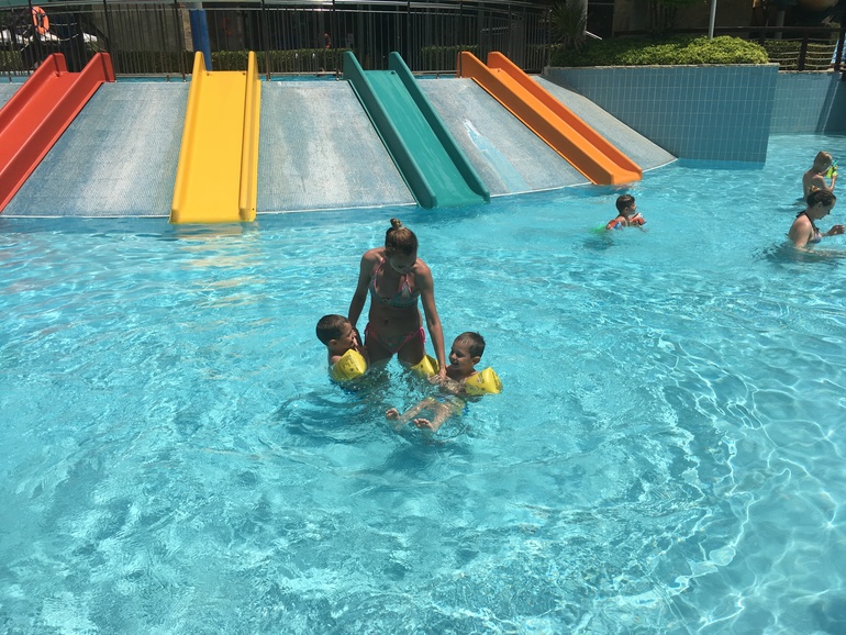 На территории 3 взрослых бассейна, 1 детский с песчаным дном, и 1 небольшой с горками (4 горки).
