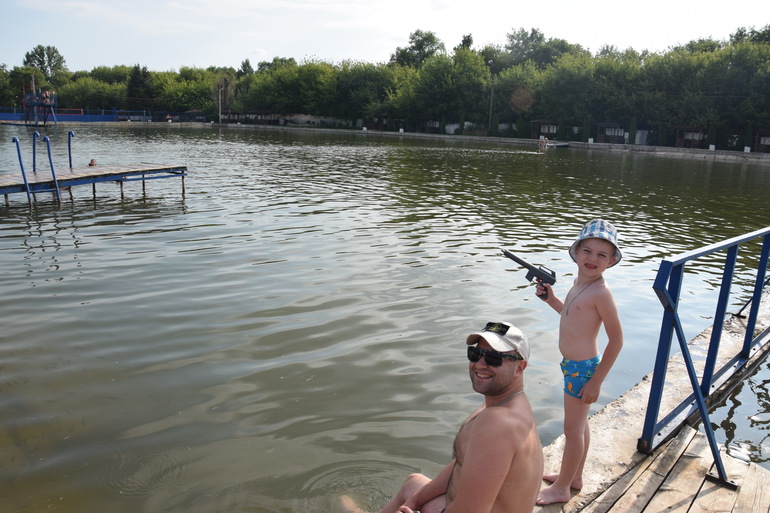 На улице ещё стояла жара,отправились в "Акваторию". Это искусственный пруд. Вход 200р. со взрослого (100-детский билет) любому человеку, гостям комплекса-20р. за браслет. Пруд большой,вода не кристально чистая,но вполне пригодна для купания. Теплая. Заход неочень для деток, только с лестницы,так как вход с плит опасен,плиты скользкие. Но нам и так сойдёт:)я первый раз за лето искупалась.