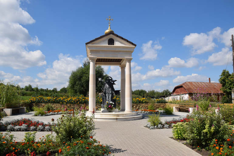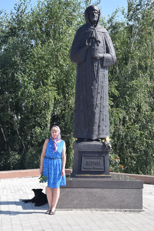 с. Себино. Здесь родилась Святая Матрона и прожила в селе до 1925г.,до переезда в Москву. Родители Матроны так и жили до конца дней в этом селе,но захоронения их не обнаружили,также как и её дом. По преданию,где находился её дом, сейчас расположен памятник Матроне в ротонде.Стоит Матрона и протягивает руки к верующим. И каждый подходит к Святой,берет её за руки и просит о самом сокровенном. Купив живые хризантемы (ведь Матронушка любила живые цветы), мы с сыном подошли к памятнику. Я когда взяла её за руку,у меня полились слёзы, сама не ожидала от себя.Так трогательно.