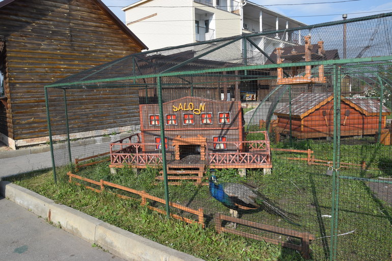 Около пруда домики с живностью:павлином,курочками,утками. Мини зоопарк.