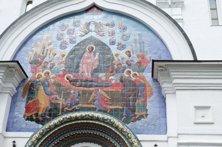 перед входом - мозаичная икона "Успение Пресвятой Богородицы"