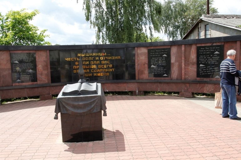 на стене высечены фрагменты писем фронтовикам-мышкинцам от их семей, обратите внимание, кто будет там гулять, очень интересно почитать. И отдохнуть от прогулок на площади тоже приятно