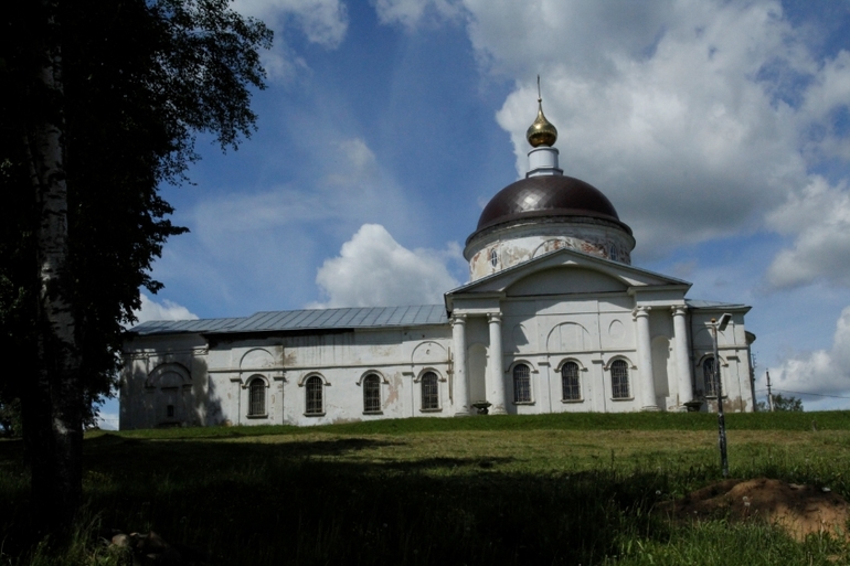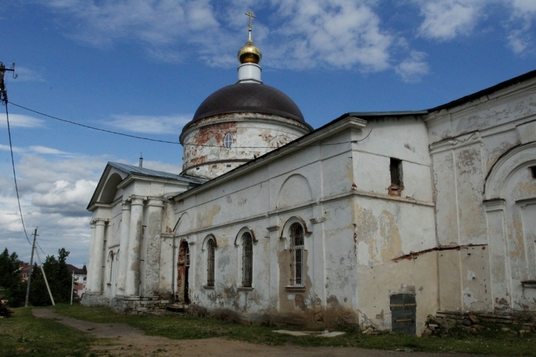Есть в Мышкине и еще один более новый храм. Ну как новый, возведен он был в начале 19 века, но после революции так же был разграблен, колокола его были разбиты. Звонница использовалась вместо водонапорной башни, а сам храм - это был льняной склад. И только в 2009 году началось его восстановление. вот так он выглядит сейчас