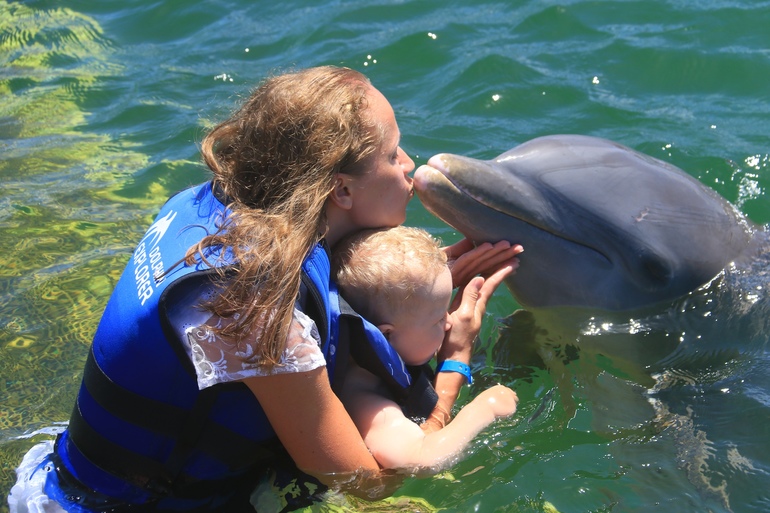 По сути, это 40-минутное контактное представление непосредственно в воде с дельфинами и тренером. Группа небольшая, 5 человек; ребёнок был у меня на руках.