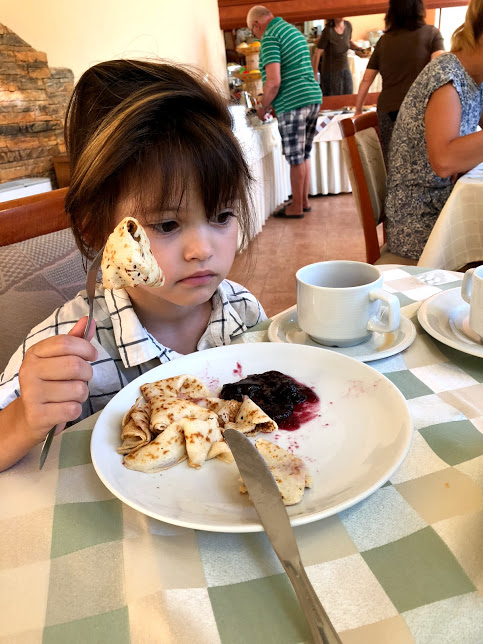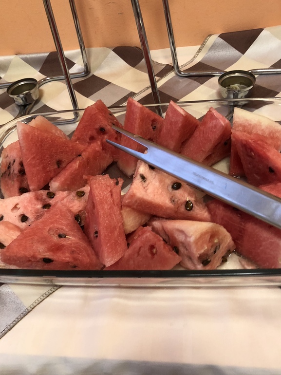 На завтрак предлагают и блинчики ,вафли бельгийские,тосты ,разные булочки ,омлет,каши 2вида хлопья, варенье ,арбуз