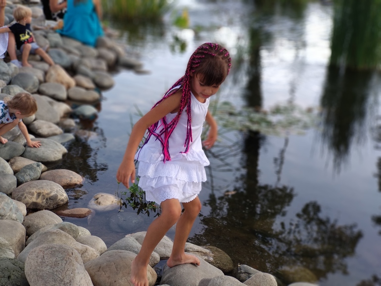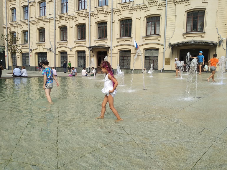 После отпуска дети лезут в воду везде,хорошо что Аня к площадке заснула,на Ильинке еле их вытащила ее из фонтана. Ну и Маша в первых рядах.