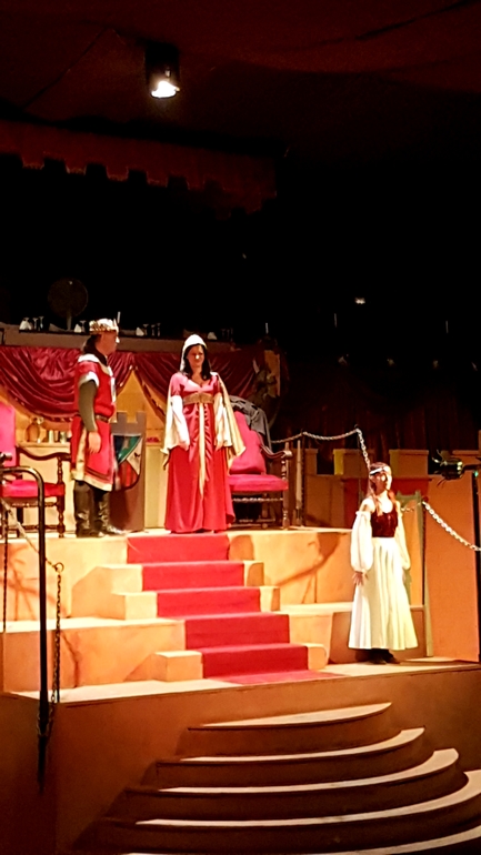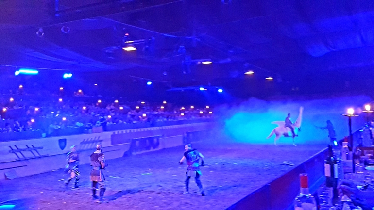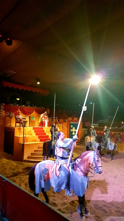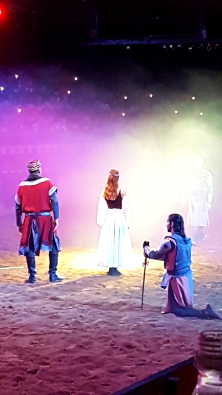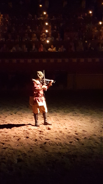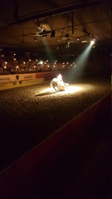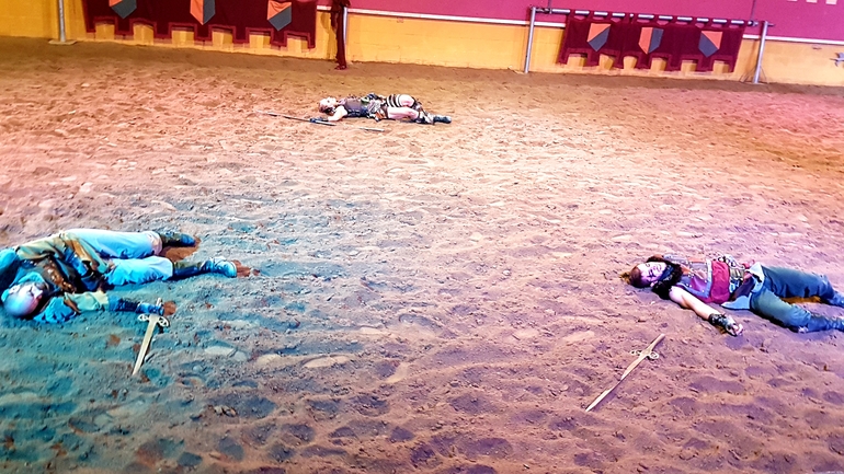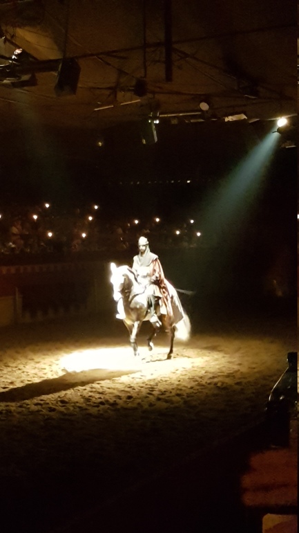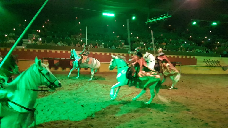 Сначала все наездники продемонстрировали свою удаль, выполняя различные трюки, а затем началось побоище. Возможно спектакль не произвел бы сильного впечатления, если бы не атмосфера. Сидишь вся такая в короне с курицей в зубах руках, ни салфеток, ни приборов. Волей не волей ощущаешь себя именно там, в далеком прошлом) Мои фото конечно тоже треш, камера не справлялась ни с приглушенным светом, ни с движущимися объектами. Но уж очень хотелось запечатлеть на память. После спектакля был концерт, сначала выступал испанский певец, затем началось шоу Фламенко. Все имеют представление, что это такое, поэтому когда на сцену вскочили две лошади и начали выстукивать ритм копытами, мы очень удивились)