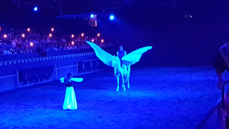 В турнире принимают участие музыканты, каскадеры наездники, артисты. Сюжет стандартный, дочь графа и графини отправляется в путь-дорогу и встречает прекрасного рыцаря. Любовь с первого взгляда, но счастье было недолгим. На рыцаря нападают и он раненый умирает на руках у девушки. Юная красавица возвращается домой. К ней сватаются, она отказывается, из-за нее происходят сражения и битвы. Убиенный рыцарь становится ангелом, и это его воины отважно сражаются за руку молодой графини. Добро победило, и влюбленные снова вместе. Вот только никак не пойму, он воскрес, или она отправилась на небеса? Он так и остался на коне с крыльями, а она робко шла рядом. Я могу ошибиться в интерпретации, испанский не мой язык, но нам сюжет показался именно таким. А дальше фото