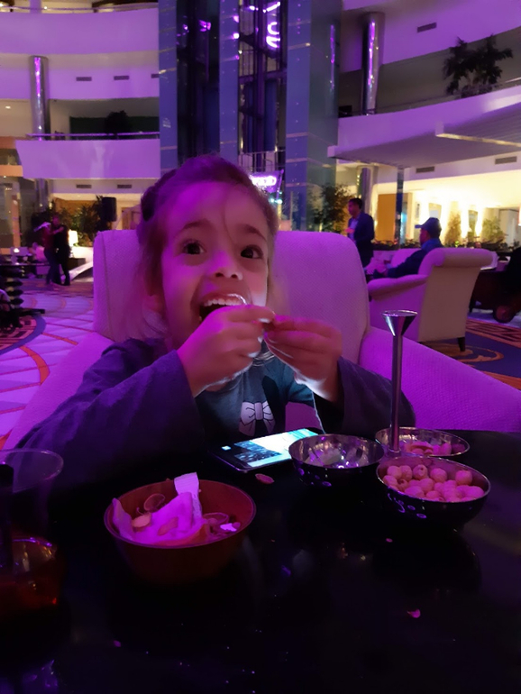 В последний наш вечер, я сбагрила детей в миниклуб ( который кстати работает с 10:00 до 00:00 без перерыва :) ) И отправилась в диско бар :) Мне было немного грустно и срочно требовался антистресс в виде горячительного:) На шестом мартини, мне галантно принесли орешки ) Видимо, что бы закусывала:) Они просто не знали, что апперитивчиками пронять русского турагента невозможно, тем более в последнюю ночь, тем более перед тем, как нужно упаковать вещи:)