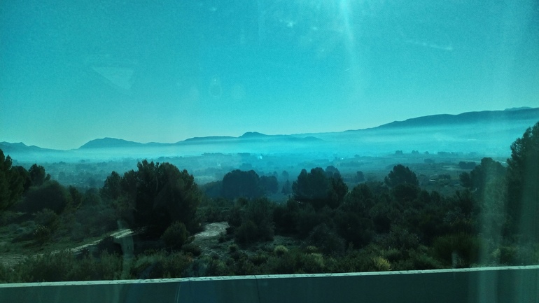 К школе мы подошли в 8.30, нас уже ждали четыре туристических автобуса. Погрузили ь и поехали. По дороге видели туман, лежащий в долинах гор (Альбуфера, куда мы направились, расположена выше над уровнем моря, поэтому ехали в гору).