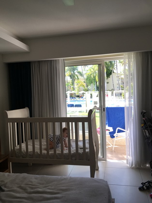 Но и тут заселиться сразу не удалось. Номера же не готовы)) Будут готовы через 40 минут. Одели нам браслеты и отправили в бар на пляже. Побрели мы туда есть (чемоданы сдали на хранение). Еда в пляжном баре так себе - фастфуд сплошной. Поэтому поклевали, что пришлось. Как раз 40 минут прошло, пошли обратно на ресепшен. Но номера все еще не готовы! Один будет готов через 20 минут, а следующий через 30 минут после первого (а это значит 50 минут)! Я была зла))) Выждали кое-как, караулили уже прямо возле номера, чтобы быстро зайти и хоть переодеться. Нахмурились в очередной раз, что ступеньки! Второй этаж! С коляской и чемоданами.
