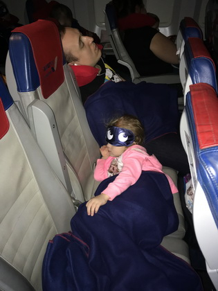 В целом полет прошел нормально. Периодически ели-спали-играли-слонялись по самолету. Мы были в передней части салона, за ней свободное пространство возле туалетов. Очень удобно, потому что можно даже просто встать постоять. С младшей пришлось повоевать, чтобы она уснула - она не любит спать вне дома, да и вообще сон - это отдельная эпопея)) Но она была уже уставшая, поэтому спать пришлось укладывать практически насильно. В остальном все прошло гладко.