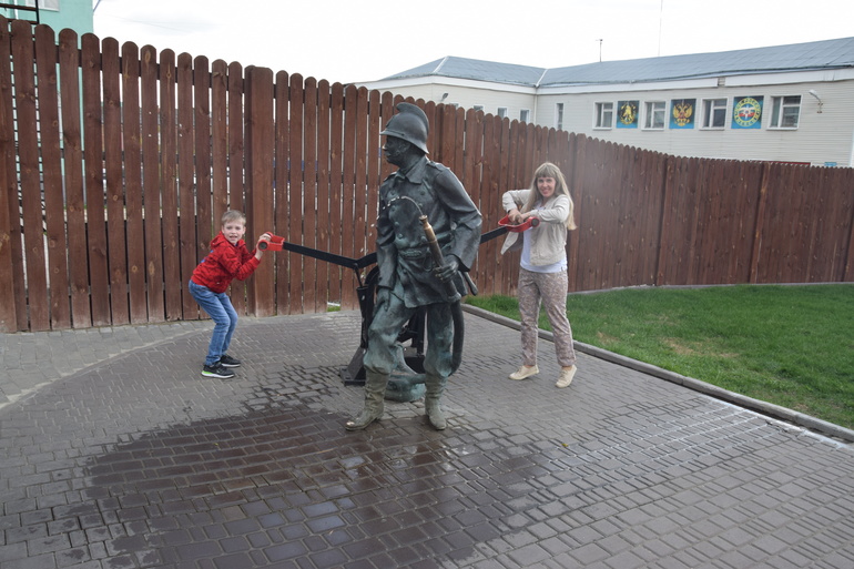 Памятник пожарному. Можно воду покачать. Там куча детей всегда!