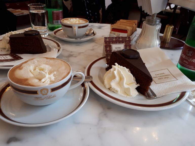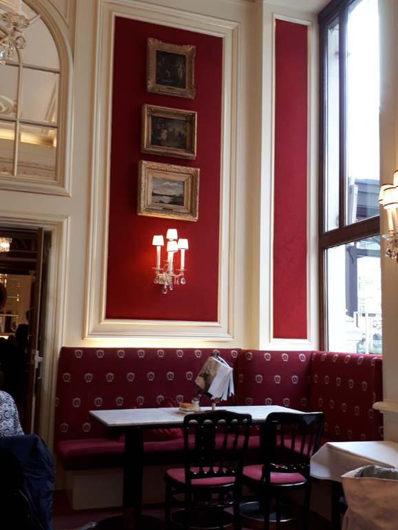 Про само кафе - ничего такого, чтобы прямо "вау". Красиво, пафосно, неоправданно дорого. Разрекламированный торт Захер обычный, а вот кофе очень вкусный, реально понравился даже мне, человеку, который кофе практически не употребляет)