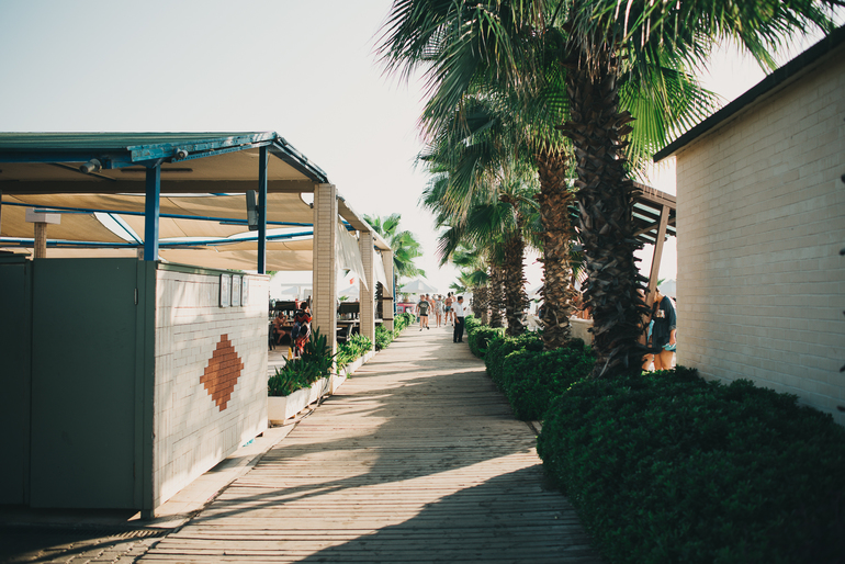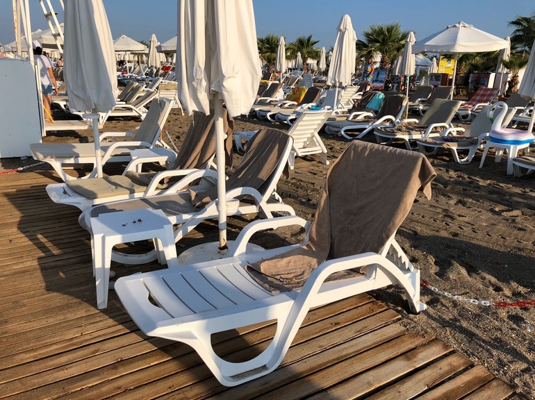 Пляж. Лежаки удобные, нам нравилось занимать те, что вдоль дорожки к пирсу, там коляска хорошо парковалась. Но да, в 8 утра уже занято почти все, а из-за большой территории от номера до пляжа минут 20 идти…