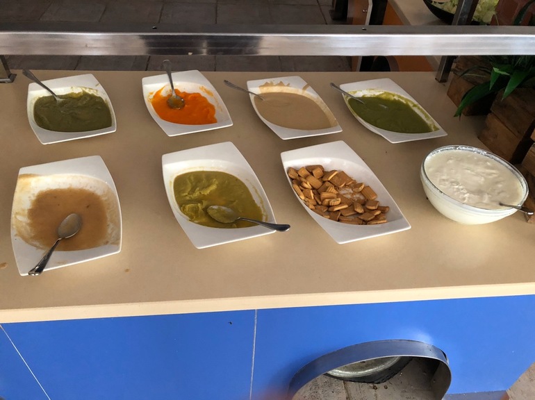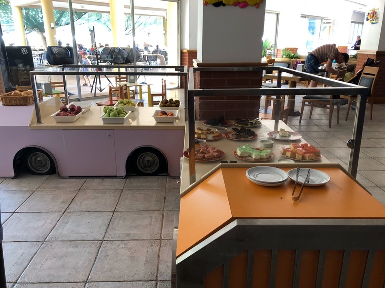 Снэк-бары у бассейнов и у пляжа. Работали в период, когда сын просыпался. Фрукты, мясо, мороженое - брали там и иногда даже вместо обеда. Вокруг движуха, все вкусно.