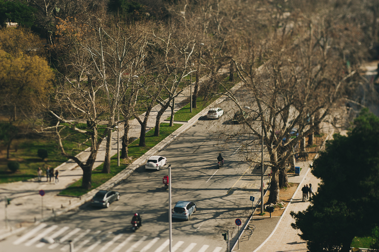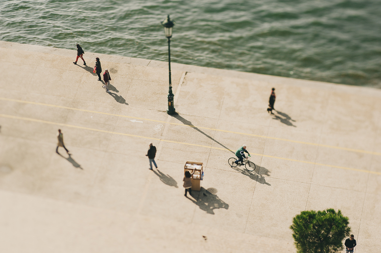 Вокруг движение, люди на велосипедах, люди отдыхают или спешат на работу. Вдоль набережной - интересная штука с зонтиками. Но и просто по улице тут хорошо идти, играя со светом.