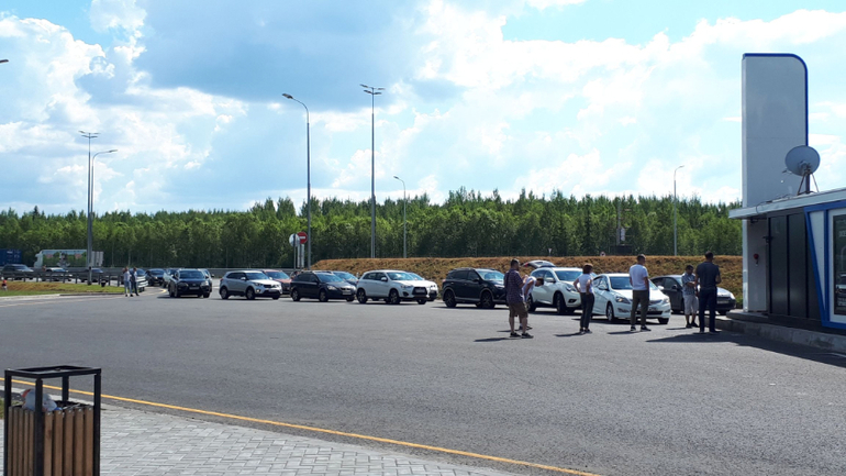 Нам не хватило бензина и пришлось заправляться на автоматической заправке между Великим Новгородом и Питером. Провели в очереди на духоте 1-10. Туалет грязный, магазина нет. Тени нет.