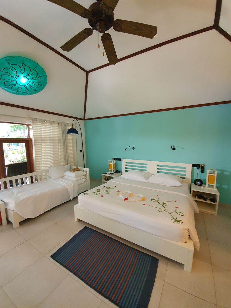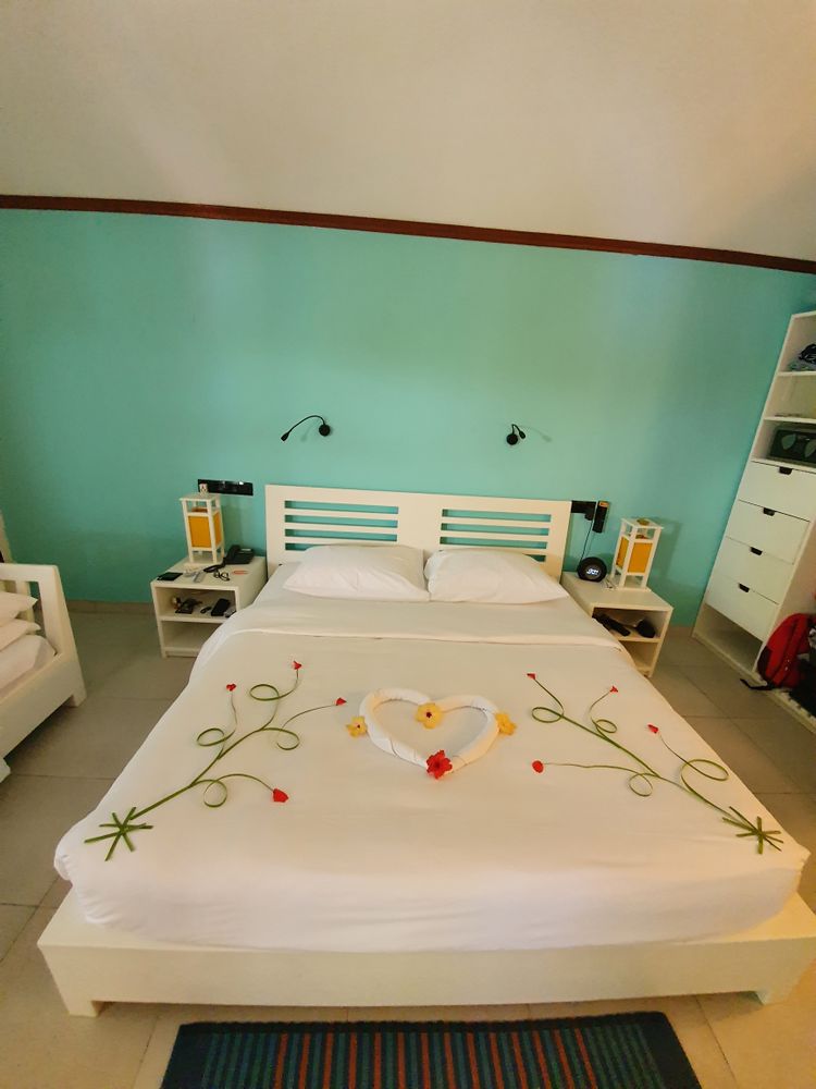 Номерной фонд отеля представлен виллами в саду, которые расположены посредине острова, как ращ рядом с основным бассейном. Мы брали именно такой тип проживания. Немного усталые, но мы там только спали. Кровать была шикарная.