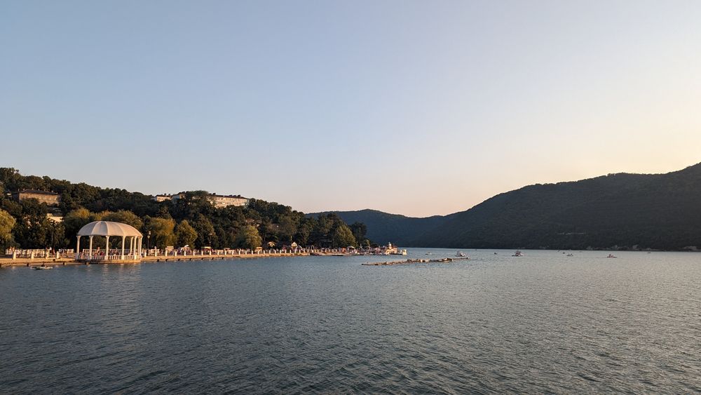 Долго в Абрау делать нечего, но на денёк скататься вполне. Ночью идёт шоу фонтанов на озере.