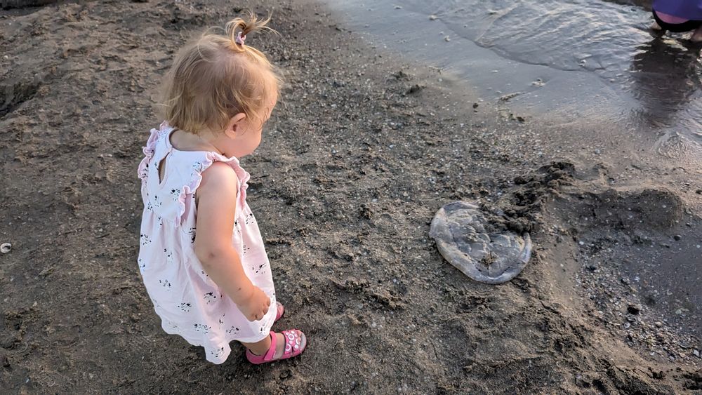 Дальше про Анапу пару слов напишу. В Анапу мы ездили не просто так, а на встречу с моей школьной подругой, которая там отдыхала с семьёй и которую я не видела 3 года. Погуляли по центру Анапы, зашли на центральный пляж. Песок классный, всяких развлекух море. Но этот непередаваемый запах водорослей🙈 мы были уже в сумерках, то есть цветущую воду было не видно, зато аромат все выдавал))) и ещё там впервые я увидела вот это! Специально рядом с Ариашкой сфотографировала, чтобы масштаб был виден. Они же были и в Сукко.
