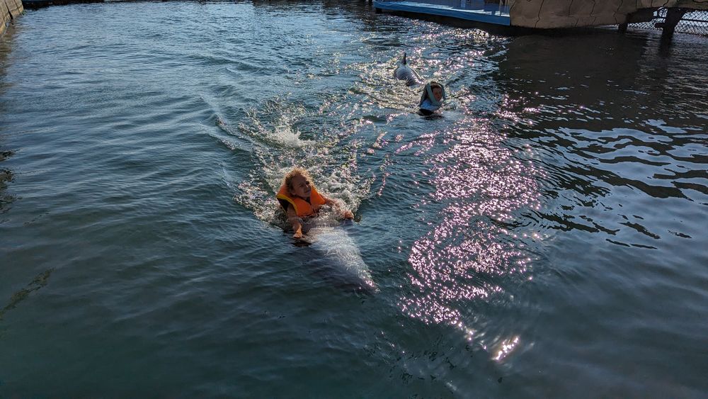 Сходили в Утришский Дельфинарий. Я иллюзий не питала, думала, так себе. Но в итоге мне понравилось! И дети в восторге! Потом Миюшка с Софийкой плавали с дельфинами. Оплатили по 3 круга каждой, но после первого круга Софийка закричала, чтобы ее вытащили на сушу)) в итоге оставшиеся 2 круга за Софийку и плюс свои 3 круга плавала Миюшка. И осталась в диком восторге))) задним умом сожалею, что и я сама не пошла с дельфинами поплавать))) за Софийку меня не пустили - у них правило, что нельзя разбивать эти заплывы на нескольких человек и все такое, но Миюшке разрешили доплавать за сестру, раз она и так уже была в воде на своем заплыве.