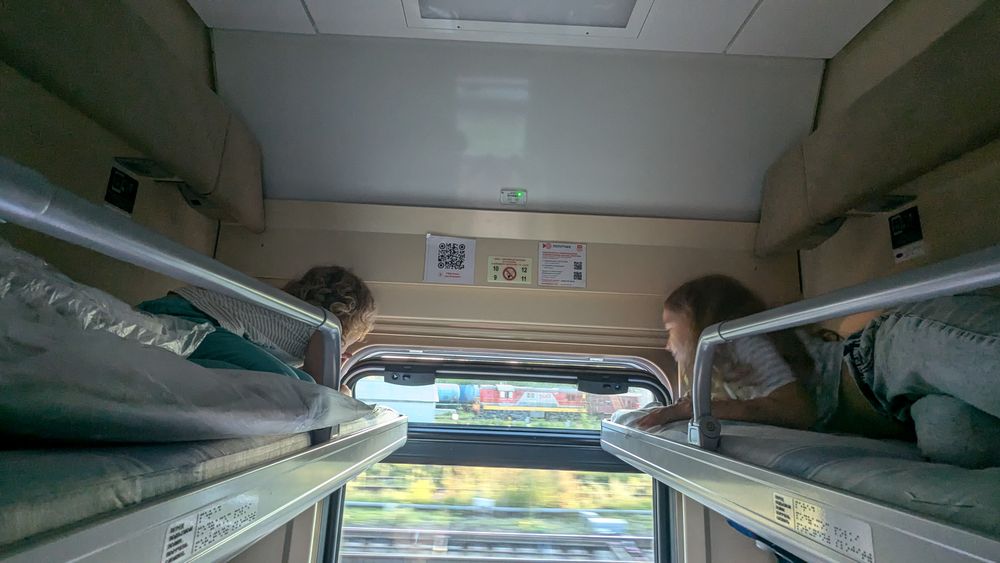А детям понравилось, что уж - романтика, приключение, стук колёс, пейзажи за окном🤣 на исходе второго дня мы включили-таки детям мульт на ноуте на верхних полках, а сами снизу сели посмотреть сериал, перевели дух)) вайфай в вагоне был заявлен, но дальше таблички дело не пошло - он не работал🤣