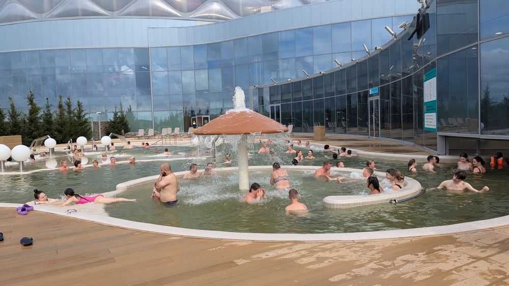 Тот бассейн, что истинный термальный лечебный источник, имеет специфический цвет, и запах, а ещё он самый горячий. Даже мне было некомфортно в нем находиться, про детей вообще молчу, поэтому оттуда мы быстро сбежали. Моей маме вот он понравился🤣 в зависимости от возраста прописано, сколько по времени можно находиться в этом бассейне. Нырять нельзя, зону сердца нужно держать над поверхностью, заходить в бассейн на разрешенные периоды не дольше 3 раз за день. На информационном табло температура воды здесь заявлена 38-43 градуса.