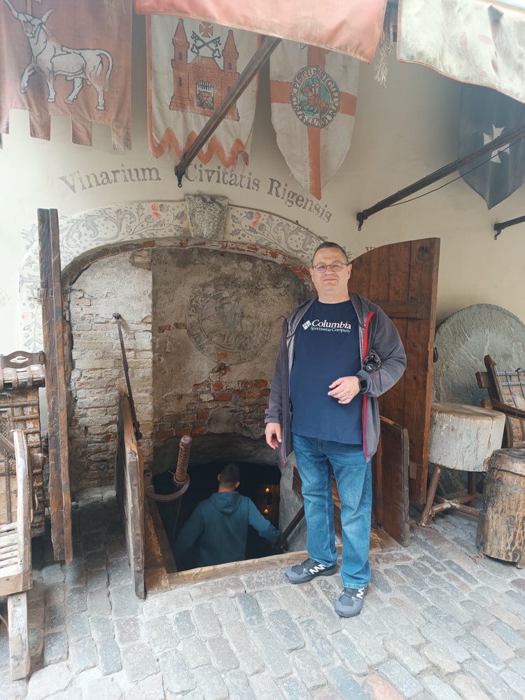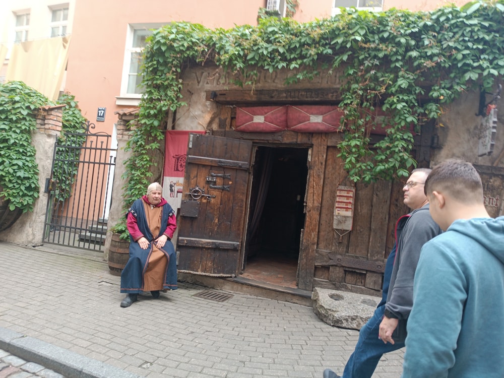 ...Мы шли в исторический центр Риги не просто так, у нас был зарезервирован подземный средневековый ресторан Розенграль. У входа сидит зазывала в историческом костюме.