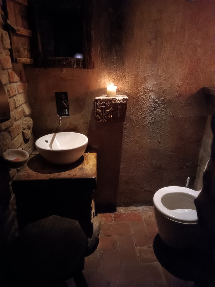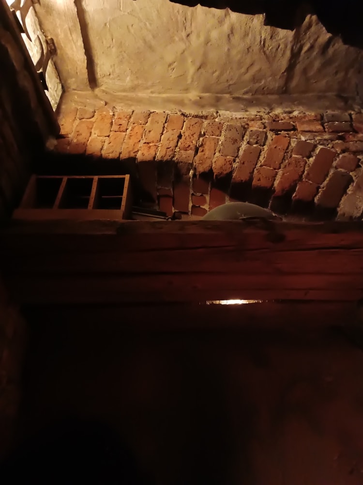 Вход по крутой лестнице, внизу бывшая винодельня с множеством подземных залов и переходов.